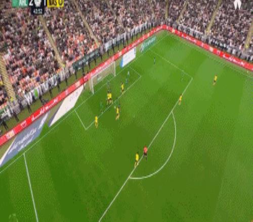 連丟2球后利雅得勝利才如夢初醒,第32分鐘,阿姆里禁區外圍轟出一腳大力遠射,桑比意外撲球脫手不慎將球漏進球門,1:2!第42分鐘,阿姆里右路斜線傳中,C羅門前頭球擦著橫梁出界;第44分鐘,布羅佐維奇角球旋入禁區,阿姆里頭球破門同樣上演梅開二度,2:2!半場結束前,還是加萊諾左路的突破橫傳,托尼打門擊中立柱差點上演帽子戲法。